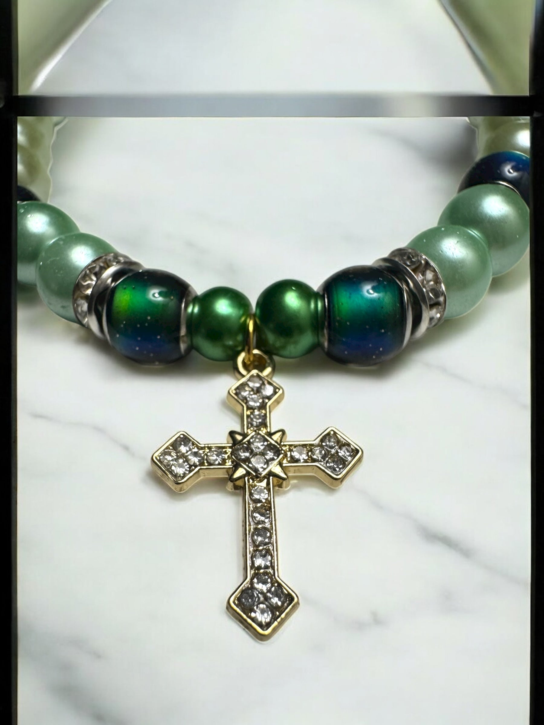 Our Always Have Faith Bracelet combines spiritual meaning with beautiful design. Featuring stunning glass beads that shimmer with green tones, and mood beads that change color! This bracelet is adorned with an elegant cross charm to keep your faith close at hand.