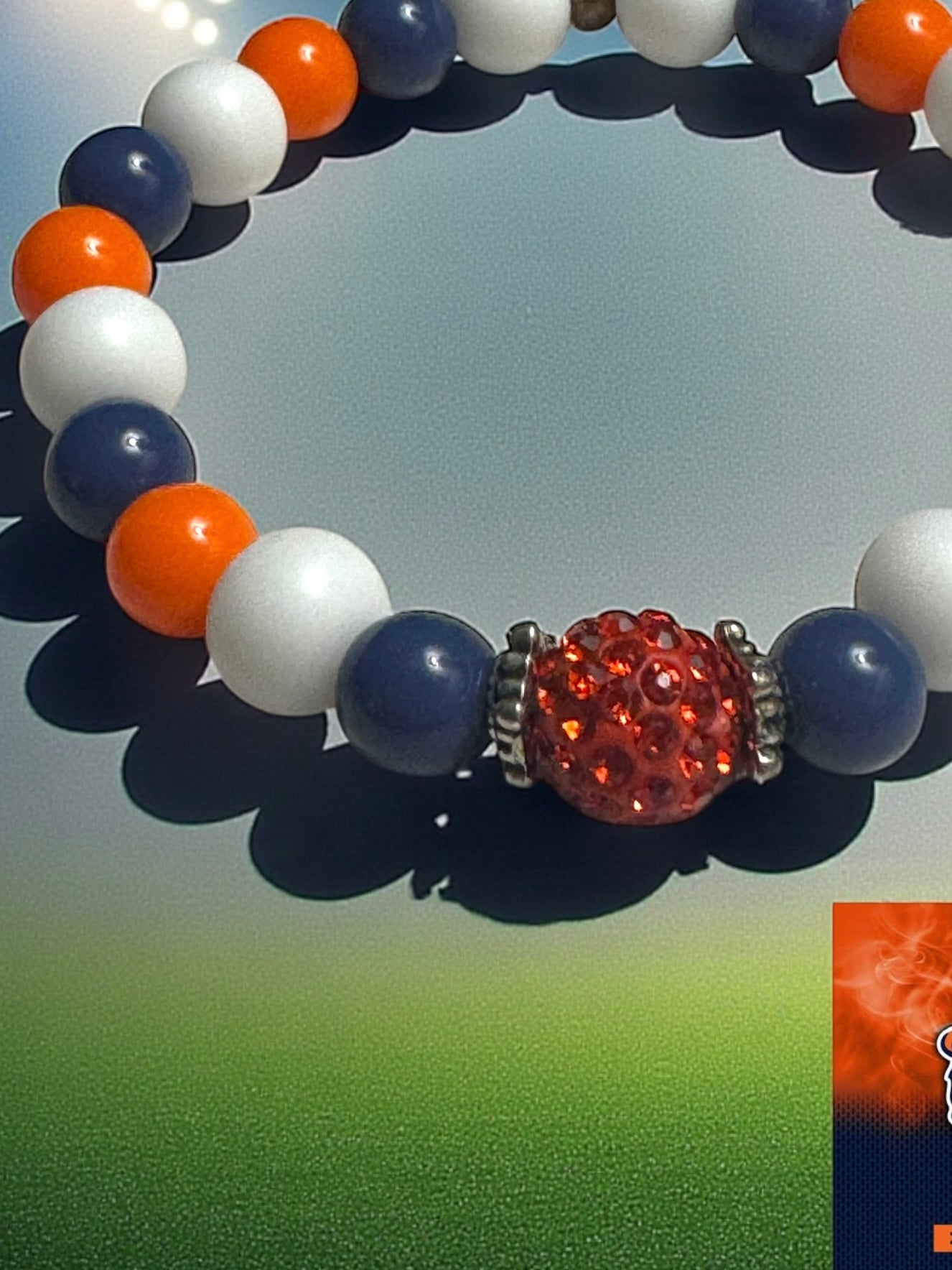 Elevate your game day attire with our Bears Football themed beaded bracelet! The beautiful orange sparkling bead adds a touch of elegance as the main focal bead. The stretch string ensures a comfortable fit, while the orange, white and navy colors represent your team spirit. Stand out in the crowd!