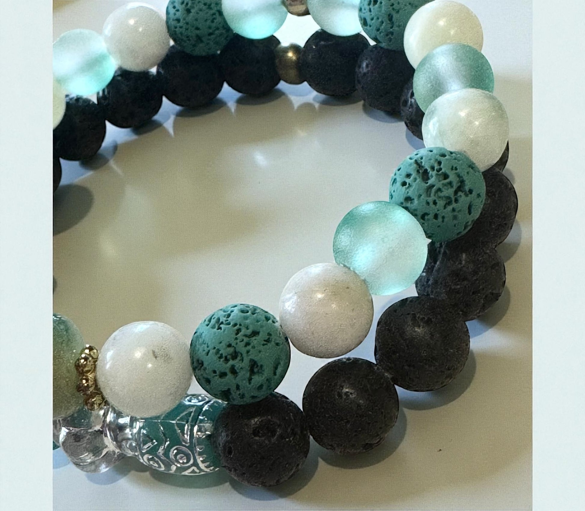 Discover the unique beauty of this handcrafted lava beaded bracelet set, featuring a stunning combination of light teal and black beads on a comfortable stretch cord. This is truly a one-of-a-kind piece - no two will ever be the same.