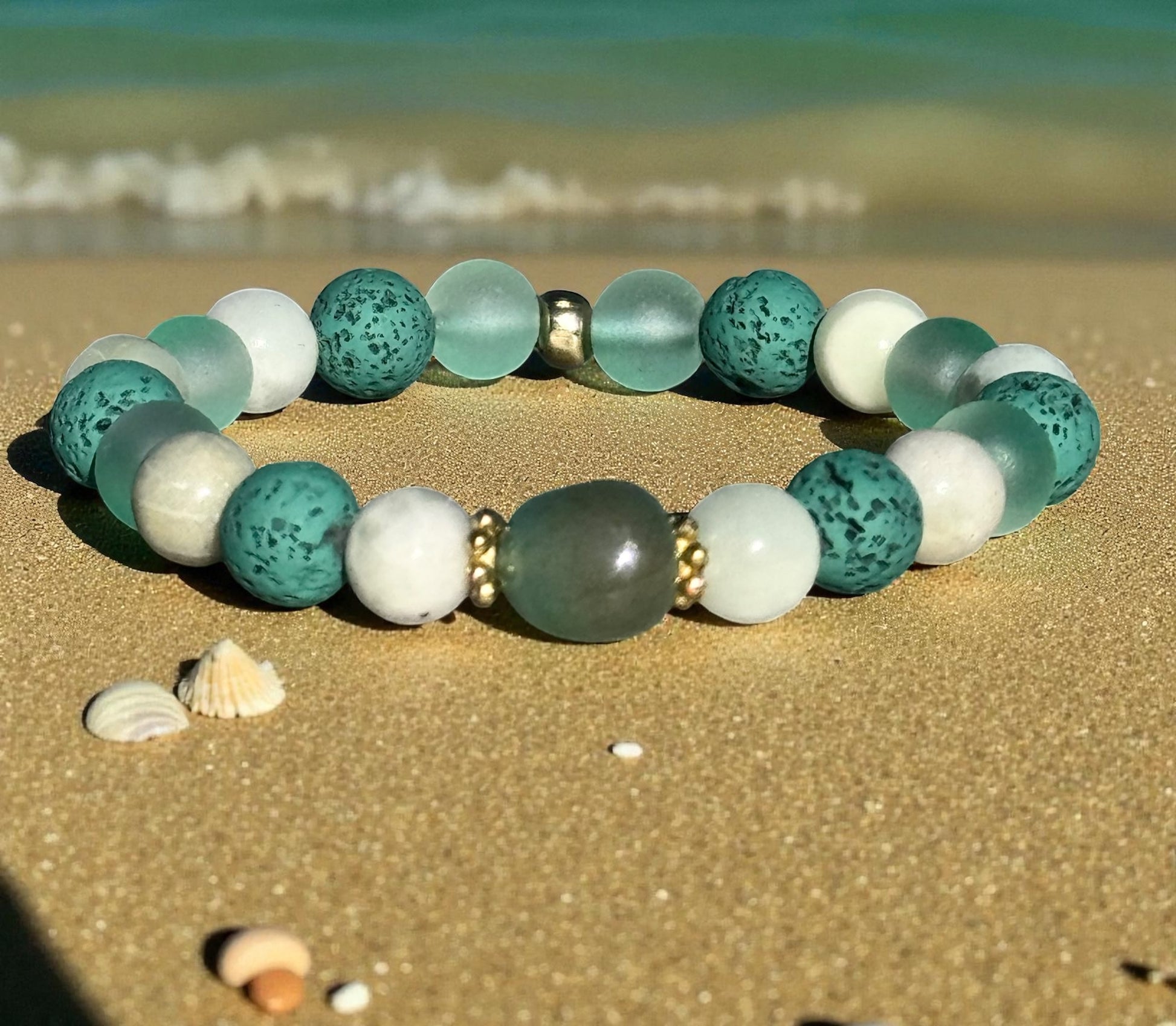 The porous lava beads can also be used with essential oils, making this bracelet both beautiful and functional. The color-shifting iridescent beads add an element of surprise and elegance as they respond to natural light.