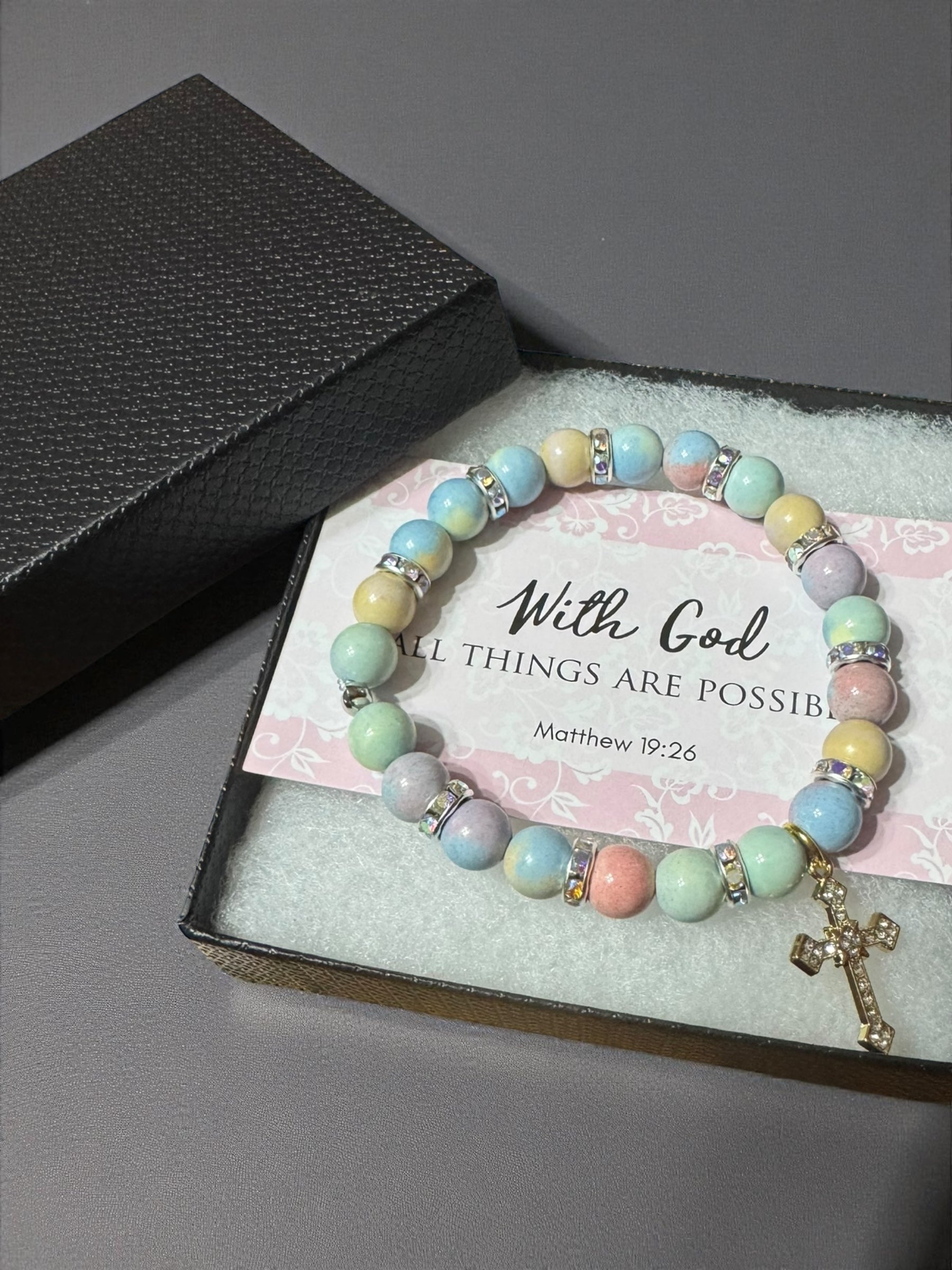 Embrace faith and inspiration with this beautiful With God All Things Are Possible bracelet featuring the beloved Matthew 19:26 scripture. This stunning faith bracelet combines pastel gemstone beads in soft shades of mint, pink, yellow, and blue, accented with sparkling cubic zirconia spacer beads and a delicate gold-plated cross charm.