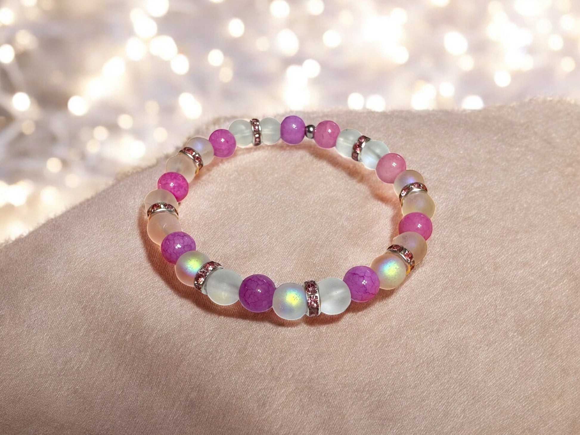 This handcrafted bracelet captures subtle beauty in every bead. Moon beads shimmer and shift in color under the light, while pink glass beads add a soft, balanced glow. Together, they create a calming, modern style that complements any outfit.